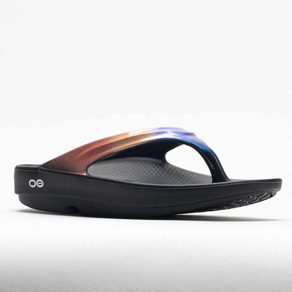 Pamper your feet to plush comfort. OOFOS OOLala Luxe recovery sandals feature OOfoam® Impact Absorption Technology that absorbs 37% more impact than regular footwear. This technology relieves stress on your feet and aids in recovery after physical activities. Hand-painted prints add style to every step as you relax after a long day.